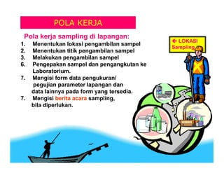 Pengepakan sampel dan pengiriman ke laboratorium. Menentukan metode pengambilan. Frekuensi dan waktu pengambilan sampel Frekuensi dan waktu pengambilan samtergantung pada beberapa faktor yaitu perubahan beban pencemaran dan debit air serta disesuaikan dengan keperluan.